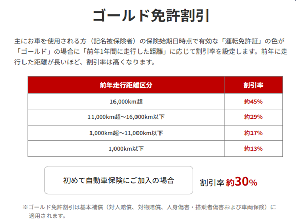 - ゴールド免許割引・・・割引率は、前年走行距離区分に応じて約13%~約45%
