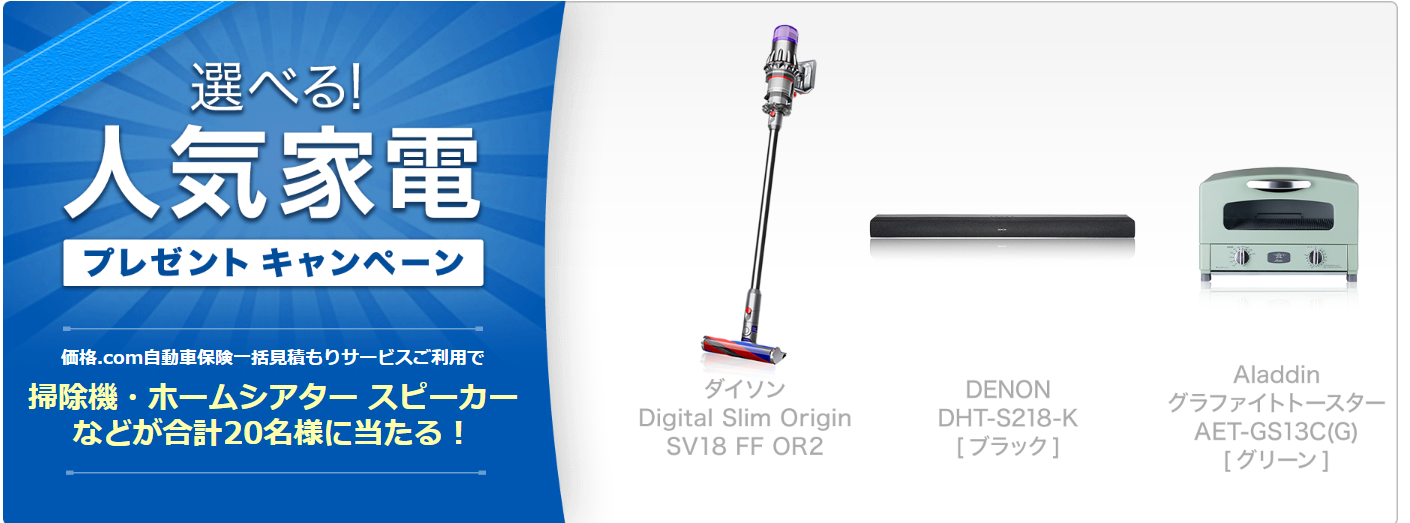 - 価格コムでは自動車保険の一括見積もりをすると抽選で家電がもらえるキャンペーンを実施中